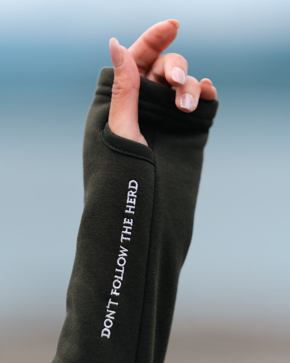 Our signature style Identity, now as hoodie! Featuring the slogan Don’t follow the herd, Stay Wild in embroidery on bottom sleeves, icon embroidery heart positioned and deconstructed Rein Love as...